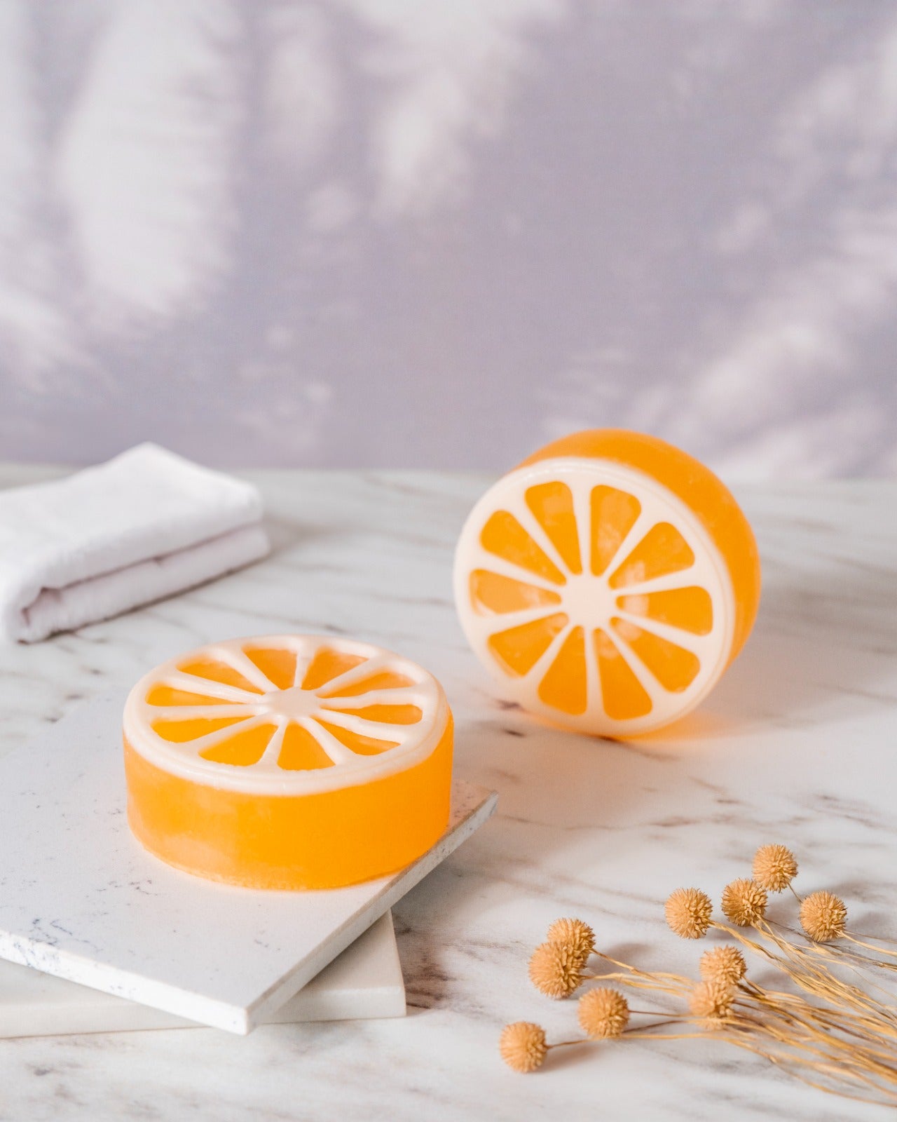 PREMIUM GLYCERINE BASE, ORANGE ESSENTIAL OIL, ORANGE PERFUME FRAGRANCE, COCONUT OIL, VITAMIN E OIL, JOJOBA OIL.